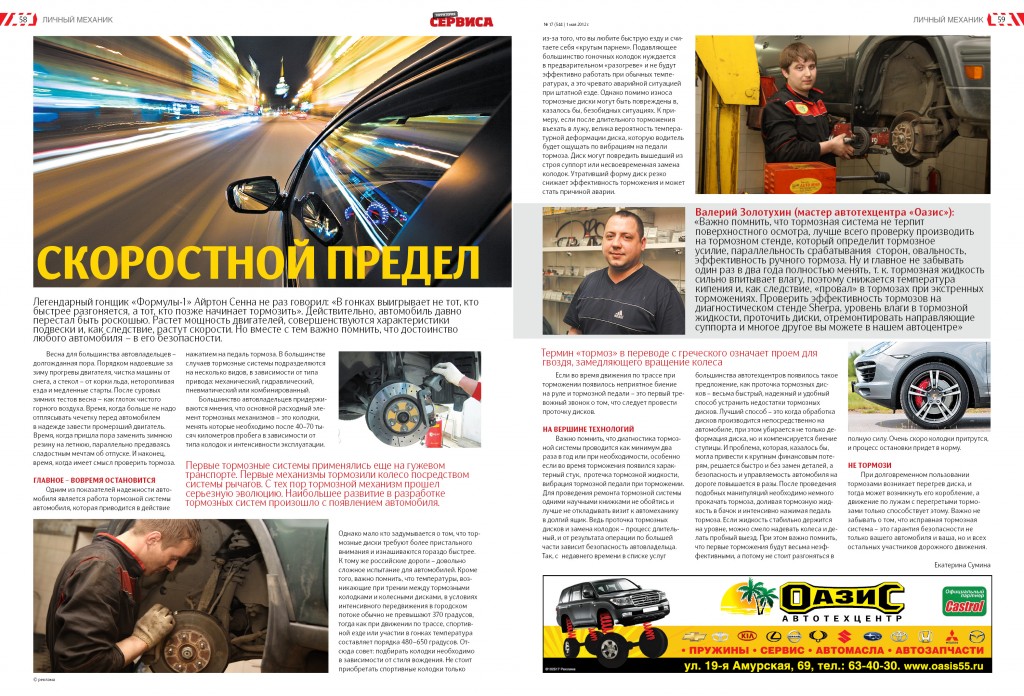 Врез: Валерий Золотухин (мастер автотехцентра «Оазис»): Важно помнить, что тормозная система не терпит поверхностного осмотра, лучше всего проверку производить на тормозном стенде, который определит тормозное усилие, параллельность срабатывания сторон, овальность, эффективность ручного тормоза. Ну и главное не забывать один раз в два года полностью менять, т.к. тормозная жидкость сильно впитывает влагу, поэтому снижается температура кипения и как следствие «провал» в тормозах при экстренных торможениях. Проверить эффективность тормозов на диагностическом стенде «Sherpa», уровень влаги в тормозной жидкости, проточить диски, отремонтировать направляющие суппорта и многое другое Вы можете в нашем автоцентре.